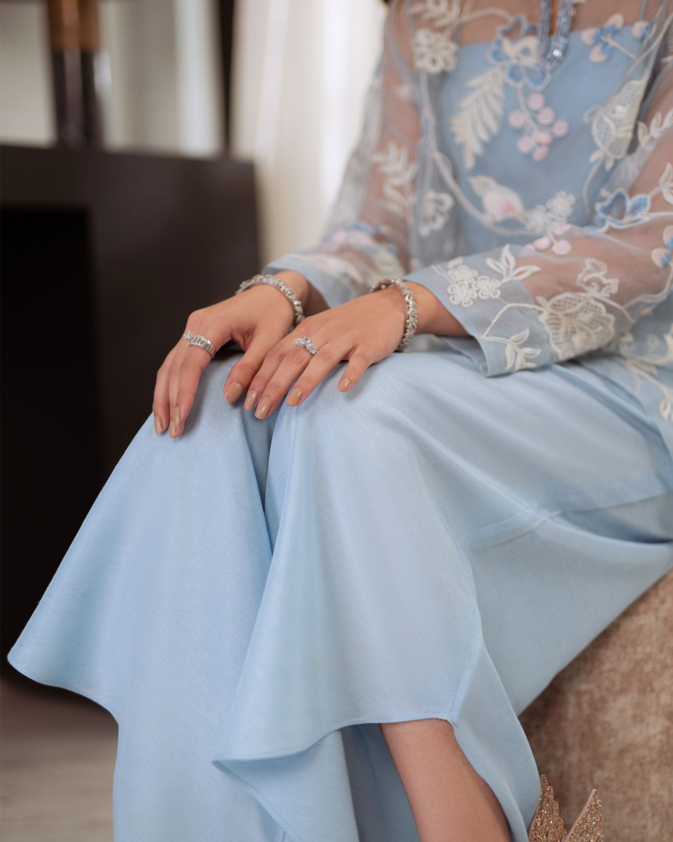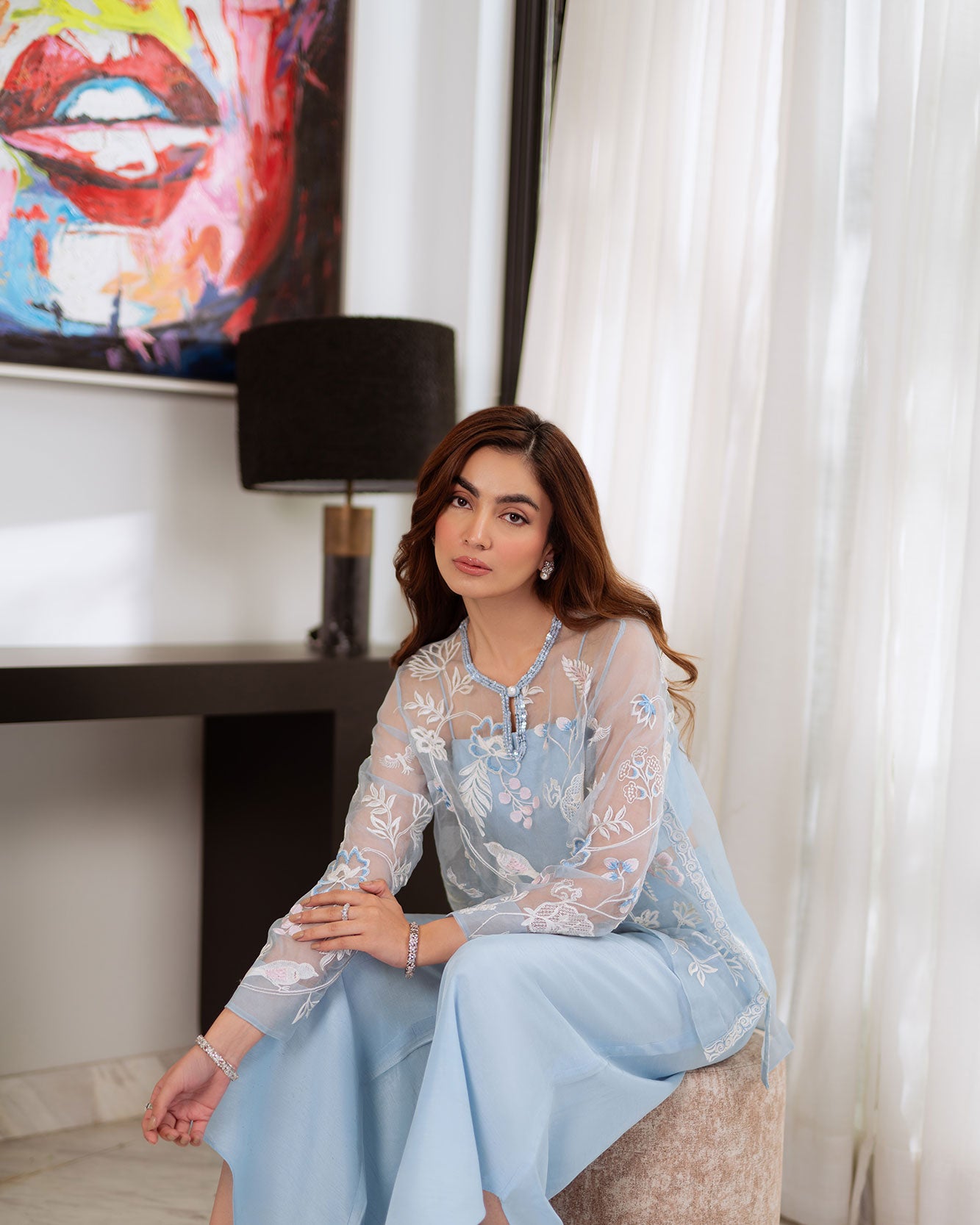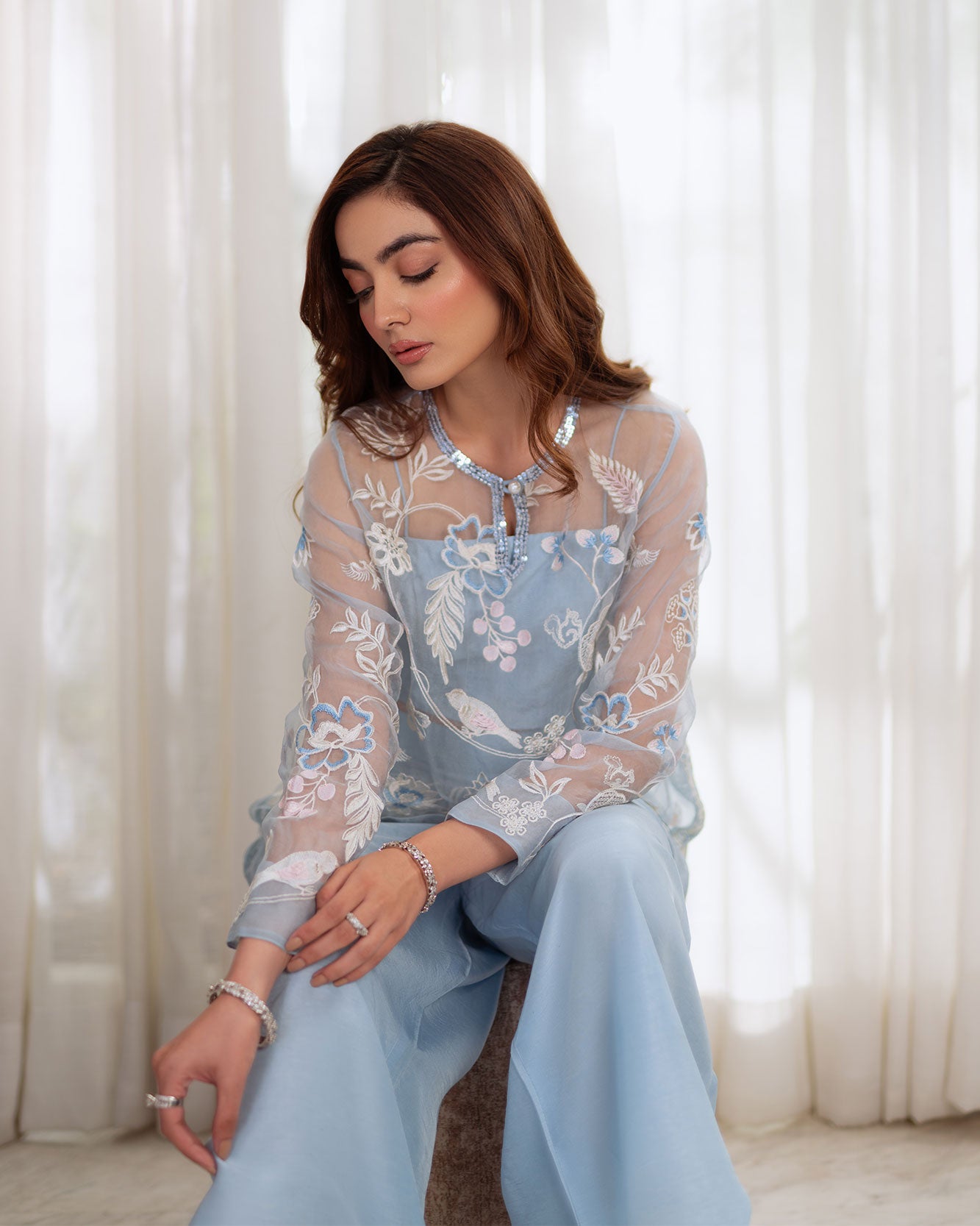 The finely tailored frosted blue organza shirt features an intricately hand worked neckline, adorned with dreamy embroidery that captures delicate craftsmanship at its finest. Paired with raw silk petal-legged pants. The craftsmanship is nothing short of breathtaking.