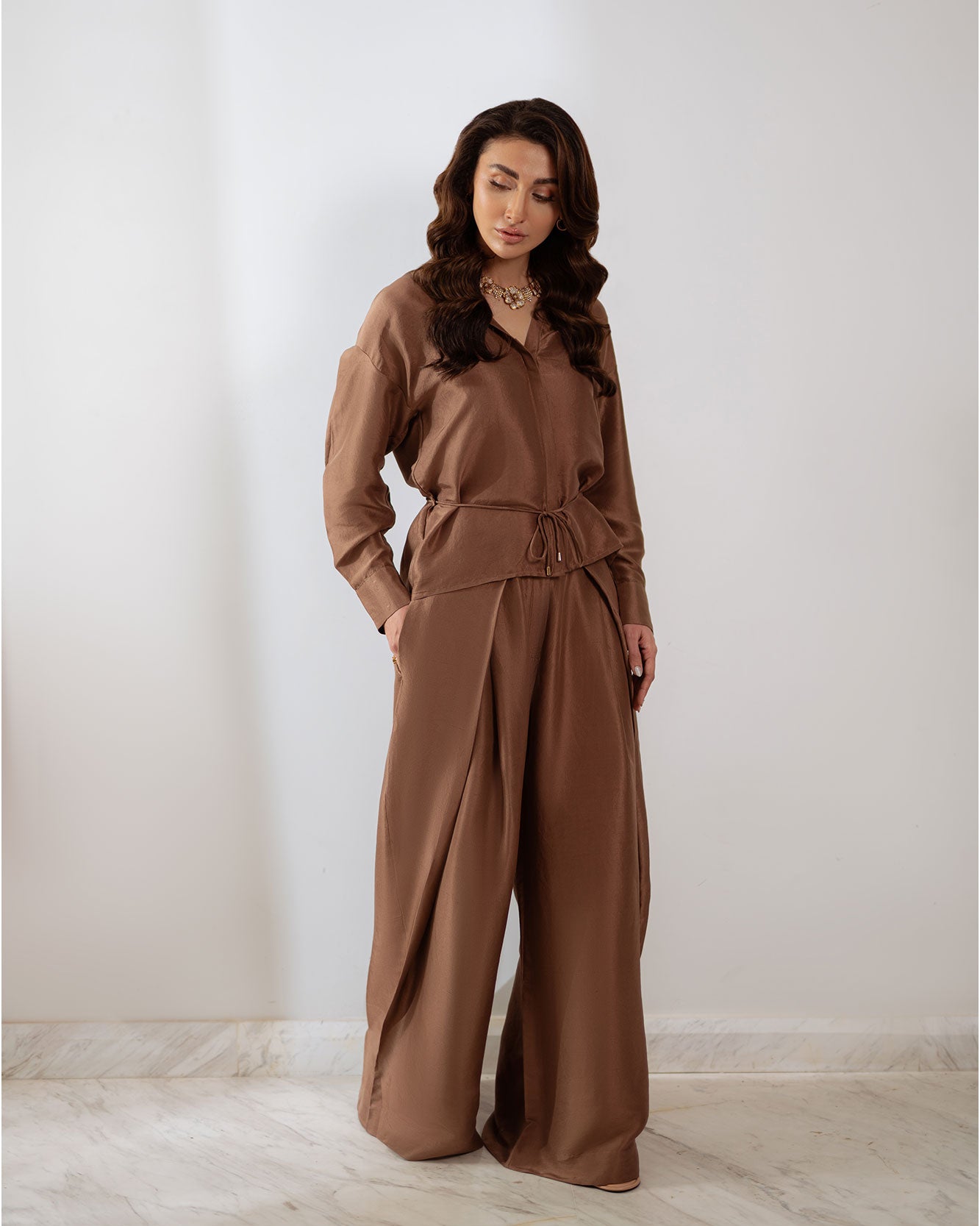 Head-to-toe confidence defines this chic mocha brown raw silk co-ord set, designed for effortless sophistication. The subtle button-down shirt features relaxed dropped shoulders and fitted cuffs, while a delicate drawstring detail cinches the waist for a flattering, structured silhouette. Paired with high-waisted pleated flared pants, the ensemble flows with graceful movement and modern ease.