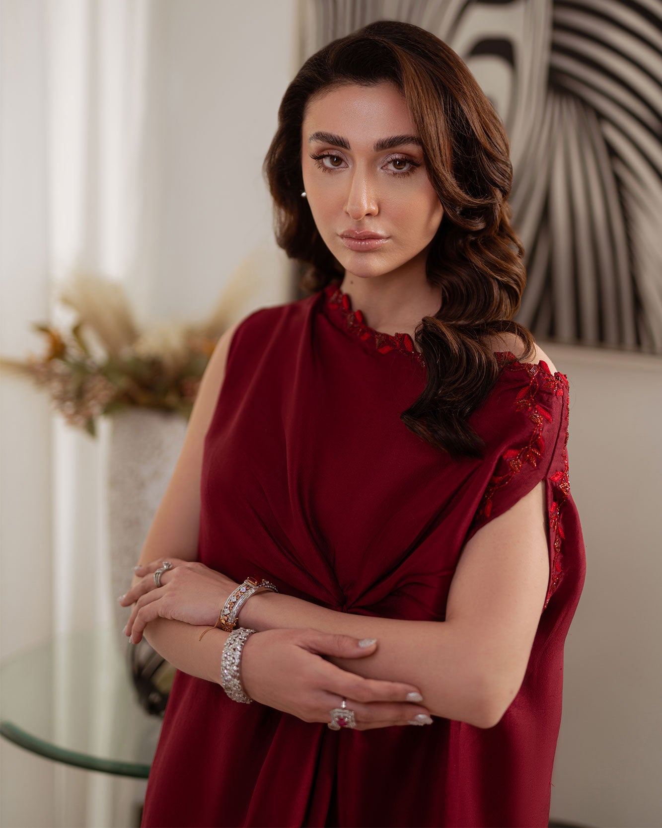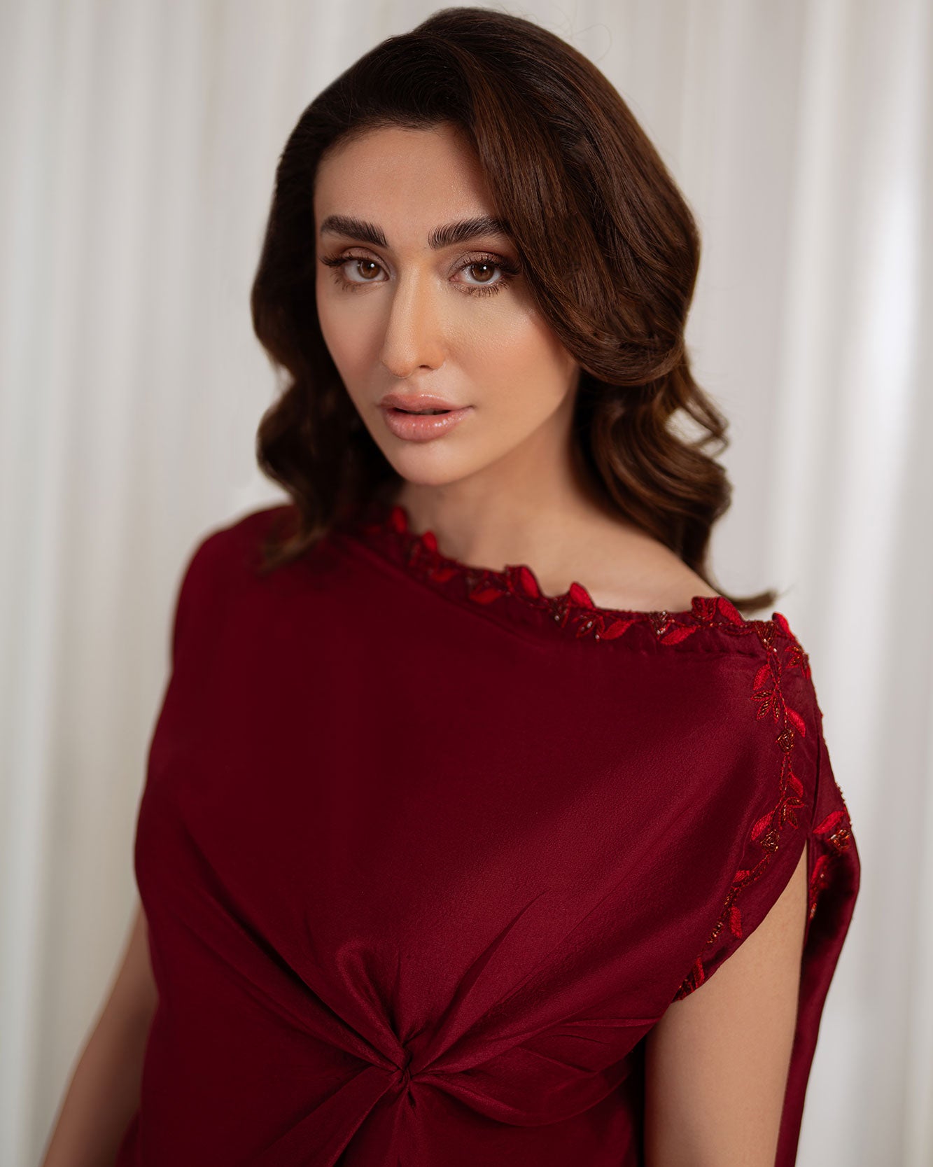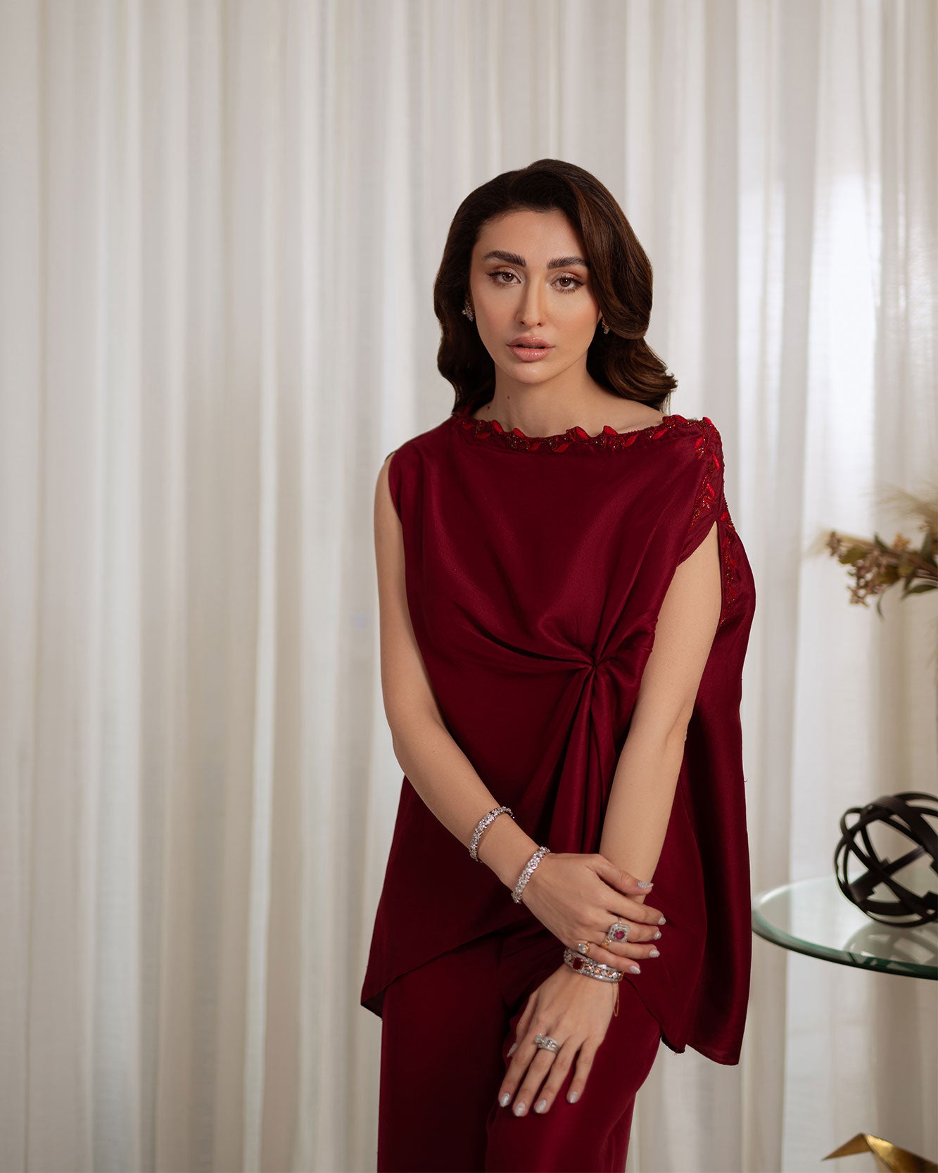 A stunning rosewood raw silk off-shoulder shirt designed to make a statement, delicately accentuated with dainty self-on-self heart handwork that adds a subtle touch of romance. The front knot detail enhances the silhouette, lending effortless charm and femininity. Paired with high-waisted raw silk wide-leg pants. Made for unforgettable festive moments.